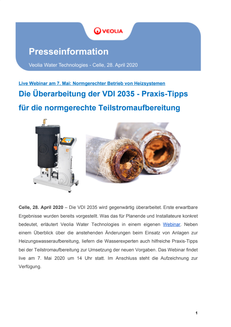Die VDI 2035 wird gegenwärtig überarbeitet. Erste erwartbare Ergebnisse wurden bereits vorgestellt. Was das für Planende und Installateure konkret bedeutet, erläutert Veolia Water Technologies in einem eigenen Webinar.
