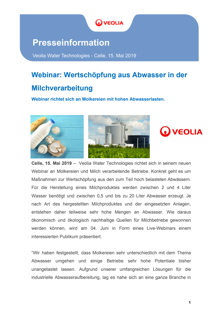 Veolia Water Technologies bietet spezielle Webinare zu einzelnen Themen in der Wasseraufbereitung an. Am 04. Juni dreht sich alles um Molkereien und Milch verarbeitende Betriebe. Unter dem Titel "Wertschöpfung aus Abwasser in der Milchverarbeitung" geht es diesmal um die Erzeugung von Biogas.
