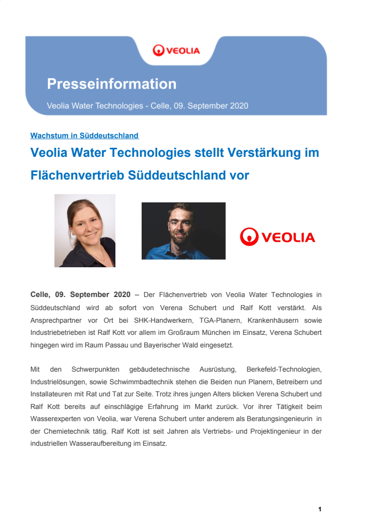 Der Flächenvertrieb von Veolia Water Technologies in Süddeutschland wird ab sofort von Verena Schubert und Ralf Kott verstärkt. Als Ansprechpartner vor Ort bei SHK-Handwerkern, TGA-Planern, Krankenhäusern sowie Industriebetrieben ist Ralf Kott vor allem im Großraum München im Einsatz, Verena Schubert hingegen wird im Raum Passau und Bayerischer Wald eingesetzt.