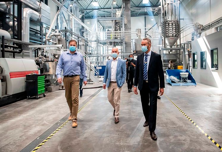 Finanzminister Jan Tore Sanner hat am 9. Juni Norwegens erste Recyclinganlage für Pfandflaschen bei Heia in Fetsund eröffnet. Von links: Anlagenleiter Torben Beck (Veolia), Finanzminister Jan Tore Sanner und der Administrierende Direktor von Infinitum, Kjell Olav Maldum.