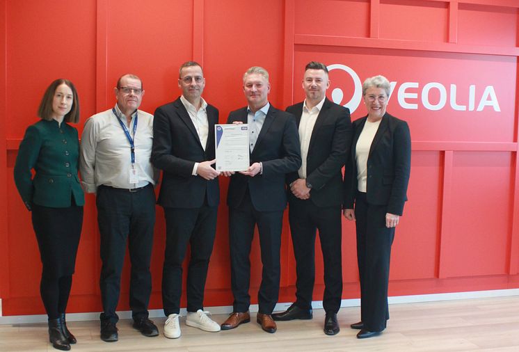 Feierlich wird die Urkunde zur erfolgreichen Zertifizierung überreicht Personen v.l.n.r.: Claire Martin (Veolia), Rob Pattison (Veolia), Guido Adomßent (Veolia), Hubert Spahn (DQS), Thomas Dembski (DQS), Astrid Lex (Veolia)