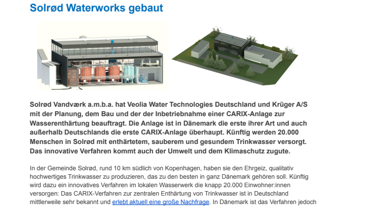 Solrød Vandværk a.m.b.a. hat Veolia Water Technologies Deutschland und Krüger A/S mit der Planung, dem Bau und der der Inbetriebnahme einer CARIX-Anlage zur Wasserenthärtung beauftragt. Die Anlage ist in Dänemark die erste ihrer Art und auch außerhalb Deutschlands die erste CARIX-Anlage überhaupt. Künftig werden 20.000 Menschen in Solrød mit enthärtetem, sauberem und gesundem Trinkwasser versorgt. Das innovative Verfahren kommt auch der Umwelt und dem Klimaschutz zugute.