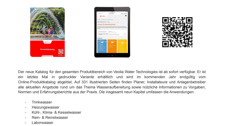 “Mit dem Ausbau unseres digitalen Angebotes online-produktkatalog.de können wir unseren Kunden viel mehr Informationen und Unterstützung bieten - und das jederzeit, von jedem Ort aus und auf allen gängigen Geräten wie PCs, Smartphones und Tablets. Daher ist der Wechsel auf den Online Katalog jetzt folgerichtig. Um den Umstieg auf den digitalen Produktkatalog für unsere Kunden zu unterstützen enthält die letzte Ausgabe des gedruckten Katalogs Verweise in Form von QR-Codes und Web-Adressen”, so Simon Krämer, Leiter Produktgeschäft Veolia Water Technologies.