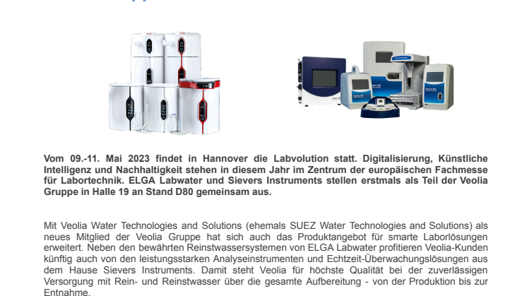 Vom 09.-11. Mai 2023 findet in Hannover die Labvolution statt. Digitalisierung, Künstliche Intelligenz und Nachhaltigkeit stehen in diesem Jahr im Zentrum der europäischen Fachmesse für Labortechnik. ELGA Labwater und Sievers Instruments stellen erstmals als Teil der Veolia Gruppe in Halle 19 an Stand D80 gemeinsam aus.