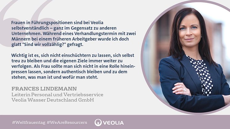 Auch Frances Lindemann, Leiterin Personal und Vertriebsservice bei Veolia Wasser Deutschland, findet ein selbstsicheres Auftreten unerlässlich: “Wichtig ist es, sich nicht einschüchtern zu lassen, sich selbst treu zu bleiben und die eigenen Ziele immer weiter zu verfolgen. Als Frau sollte man sich nicht in eine Rolle hineinpressen lassen, sondern authentisch bleiben und zu dem stehen, was man ist und wofür man steht.”