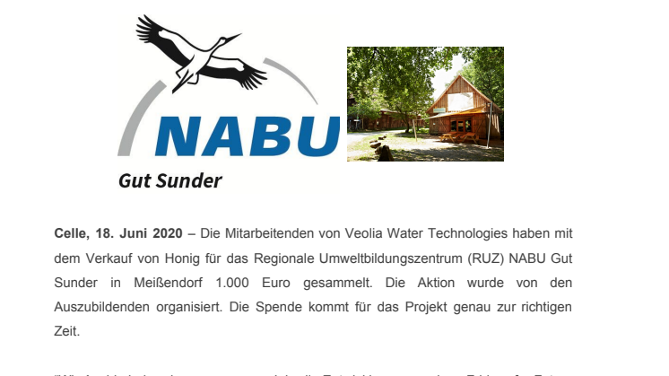 Die Mitarbeitenden von Veolia Water Technologies haben mit dem Verkauf von Honig für das Regionale Umweltbildungszentrum (RUZ) NABU Gut Sunder in Meißendorf 1.000 Euro gesammelt. Die Aktion wurde von den Auszubildenden organisiert. Die Spende kommt für das Projekt genau zur richtigen Zeit.