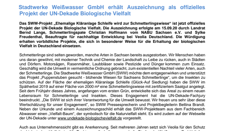 Seit dem Frühjahr dieses Jahres, angefangen vom ersten Grün, entwickelte sich das Areal zu einem neuen Lebensraum für Schmetterlinge und Insekten. Dieses Engagement hat die UN-Dekade-Fachjury beeindruckt. „Die SWW sind sich ihrer Verantwortung für die Umwelt bewusst. Wir freuen uns sehr über diese Wertschätzung für unser Engagement”, so SWW Pressesprecherin und Projektbegleiterin Bettina Brandt. Neben der Urkunde und einem Auszeichnungsschild erhält das SWW-Projektteam aus dem Fachbereich Abwasser einen „Vielfalt-Baum“, der symbolisch für die Naturvielfalt steht. Es wird zudem auf der Webseite der UN-Dekade unter www.undekade-biologischevielfalt.de vorgestellt.