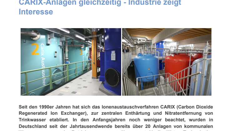 Seit den 1990er Jahren hat sich das Ionenaustauschverfahren CARIX (Carbon Dioxide Regenerated Ion Exchanger), zur zentralen Enthärtung und Nitratentfernung von Trinkwasser etabliert. In den Anfangsjahren noch weniger beachtet, wurden in Deutschland seit der Jahrtausendwende bereits über 20 Anlagen von kommunalen Wasserversorgern in Betrieb genommen. Nun sorgt Veolia Water Technologies Deutschland für einen weiteren Meilenstein: Aktuell befinden sich 12 Projekte gleichzeitig in der Planungsphase, so viele wie noch nie.