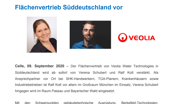 Der Flächenvertrieb von Veolia Water Technologies in Süddeutschland wird ab sofort von Verena Schubert und Ralf Kott verstärkt. Als Ansprechpartner vor Ort bei SHK-Handwerkern, TGA-Planern, Krankenhäusern sowie Industriebetrieben ist Ralf Kott vor allem im Großraum München im Einsatz, Verena Schubert hingegen wird im Raum Passau und Bayerischer Wald eingesetzt.