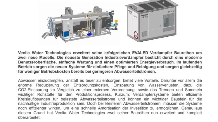 Veolia Water Technologies erweitert seine erfolgreichen EVALED Verdampfer Baureihen um zwei neue Modelle. Die neueste Generation Industrieverdampfer besticht durch eine moderne Benutzeroberfläche, einfache Wartung und einen optimierten Energieverbrauch. Im laufenden Betrieb sorgen die neuen Systeme für einfachere Pflege und Reinigung und sorgen gleichzeitig für weniger Betriebskosten bereits bei geringeren Abwasserteilströmen.