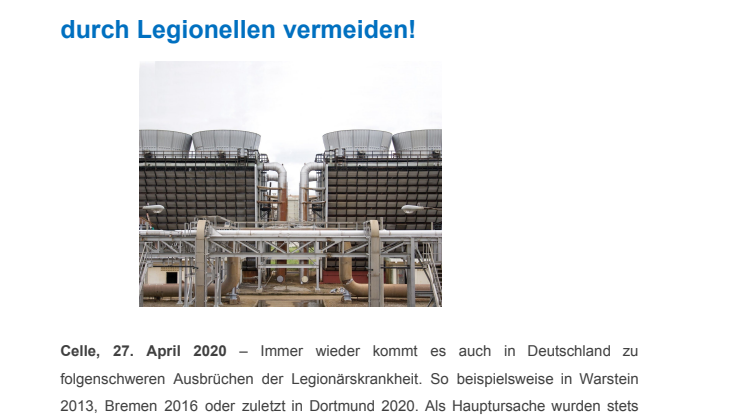 Legionellen entstehen in schlecht gereinigten Kühlanlagen. Das im Kühlkreislauf teilweise erwärmte Wasser bietet Legionellen sehr gute Wachstumsbedingungen. Durch Aerosole freigesetzt, gefährden diese die Bevölkerung und Mitarbeiter in der unmittelbaren Umgebung und können schwerwiegende Lungenerkrankungen (Legionellose) auslösen. Legionellen gelangen beispielsweise über Wassertröpfchen in die Luft und verteilen sich dort. Bei bestimmten Wetterlagen, können sie sogar über mehrere hundert Meter getragen werden. Eine durch Legionellen verursachte Lungenentzündung kann dann mitunter tödlich verlaufen.