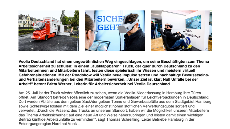 Am 25. Juli ist der Truck wieder öffentlich zu sehen, wenn die Veolia-Niederlassung in Hamburg ihre Türen öffnet. Am Standort betreibt Veolia eine der modernsten Sortieranlagen für Leichtverpackungen in Deutschland. Dort werden Abfälle aus dem gelben Sack/der gelben Tonne und Gewerbeabfälle aus dem Stadtgebiet Hamburg sowie Schleswig-Holstein mit dem Ziel einer möglichst hohen stofflichen Verwertungsquote sortiert und verwertet. „Durch die Präsenz des Trucks an unserem Standort, haben wir die Möglichkeit unseren Mitarbeitern das Thema Arbeitssicherheit auf eine neue Art und Weise näherzubringen und leisten damit einen wichtigen Beitrag künftige Arbeitsunfälle zu verhindern”, sagt Thomas Schreitling, Leiter Betriebe Hamburg in der Entsorgungsregion Nord bei Veolia.