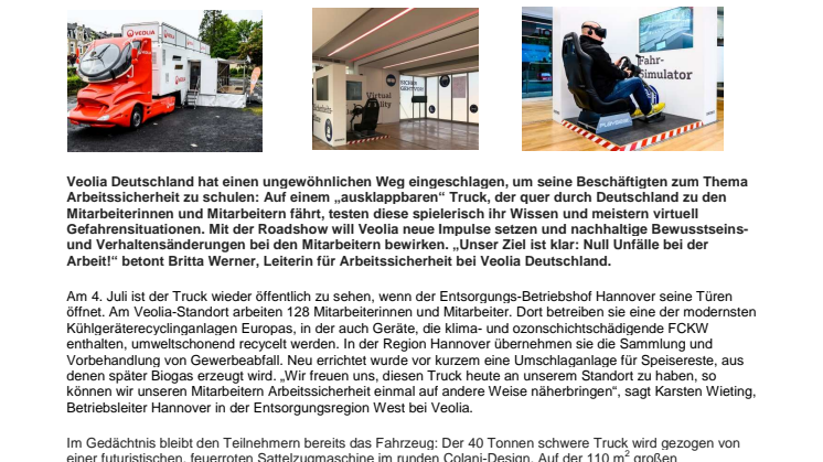 Am 4. Juli ist der Truck wieder öffentlich zu sehen, wenn der Entsorgungs-Betriebshof Hannover seine Türen öffnet. Am Veolia-Standort arbeiten 128 Mitarbeiterinnen und Mitarbeiter. Dort betreiben sie eine der modernsten Kühlgeräterecyclinganlagen Europas, in der auch Geräte, die klima- und ozonschichtschädigende FCKW enthalten, umweltschonend recycelt werden. In der Region Hannover übernehmen sie die Sammlung und Vorbehandlung von Gewerbeabfall. Neu errichtet wurde vor kurzem eine Umschlaganlage für Speisereste, aus denen später Biogas erzeugt wird. „Wir freuen uns, diesen Truck heute an unserem Standort zu haben, so können wir unseren Mitarbeitern Arbeitssicherheit einmal auf andere Weise näherbringen“, sagt Karsten Wieting, Betriebsleiter Hannover in der Entsorgungsregion West bei Veolia.