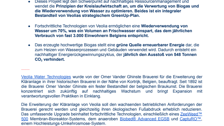 Anne Le Guennec, Senior Executive VP für weltweite Wassertechnologien bei Veolia, kommentierte: "Wir sind sehr stolz darauf, mit der historischen Omer Vander Ghinste Brauerei an diesem Projekt zusammenzuarbeiten. Es veranschaulicht perfekt, wie unsere fortschrittlichen Technologien sowohl die Nachhaltigkeit als auch die Effizienz eines Industriestandortes verbessern können. Indem wir 70% des Wassers wiederverwenden und einen erneuerbaren Energiekreislauf schaffen, demonstrieren wir, im Einklang mit unserem strategischen GreenUp-Plan, wie ökologische Innovationen Hand in Hand mit betrieblicher Effizienz gehen können."