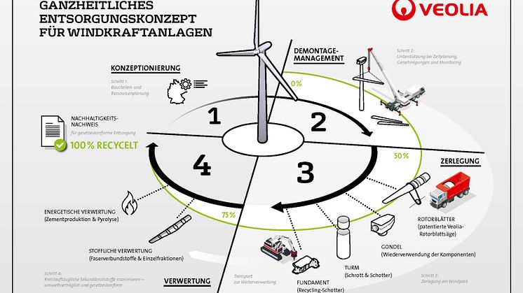 Die Recyclingquote von Windenergieanlagen ist bereits jetzt sehr hoch und liegt bei über 90 Prozent. Veolia bringt hier seine internationale Kompetenz beim nachhaltigen Rückbau ein, um möglichst viele Bestandteile recyceln und verwerten zu können. Nur wenn Nachhaltigkeitskriterien auch beim Repowering und Rückbau von Anlagen berücksichtigt würden "treffe das Adjektiv ‚erneuerbar‘ nicht nur auf die produzierte Energie während der Laufzeit des Windparks zu, sondern auch auf die verwendeten Wege und Materialien nach dem Rückbau der Anlagen“, so Dr. Markus Binding, Geschäftsführer der Veolia Umweltservice West. Windenergieanlagenrecycling könnte ein bedeutender Beitrag der Windenergiebranche zur Rückgewinnung wertvoller Ressourcen und damit zur Ressourceneffizienz sein. „Die Kreislaufwirtschaft könnte der Windenergiebranche damit helfen gefährliche Reputationsrisiken in Glaubwürdigkeitszuwächse zu verwandeln und die Energiewende in Deutschland noch ökologischer zu gestalten“, so Dr. Binding.